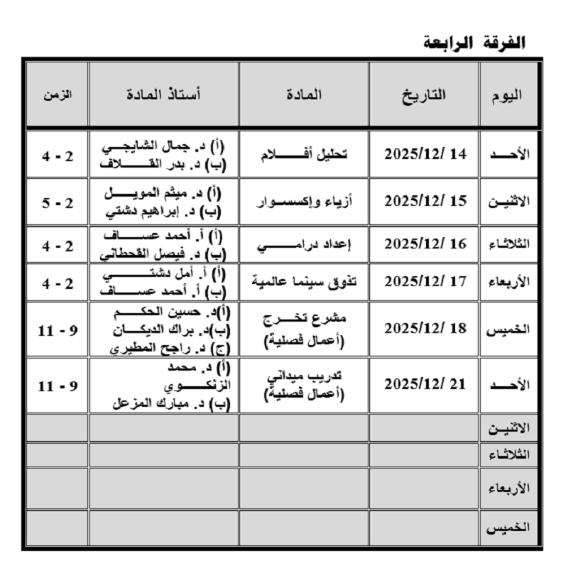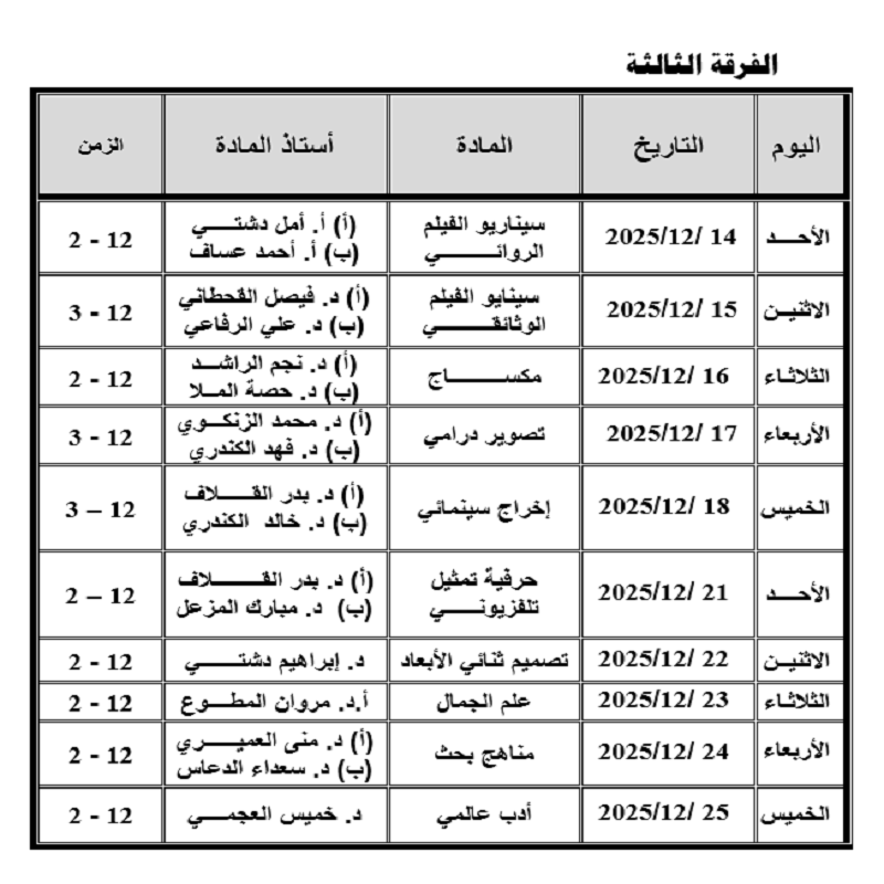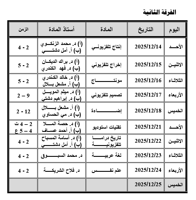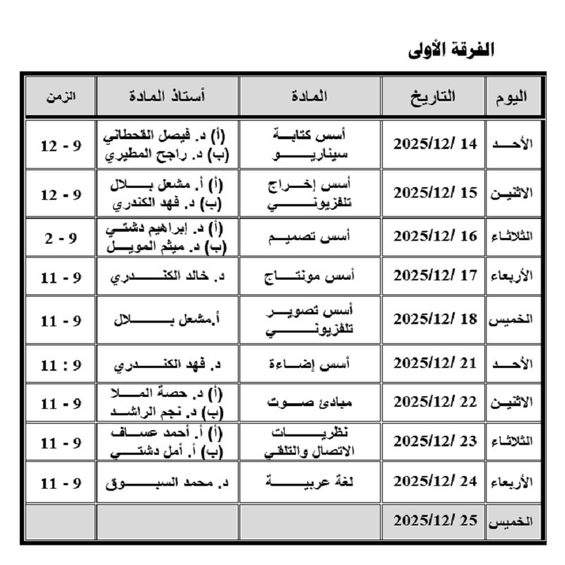 جداول امتحانات الفصل الأول – قسم التلفزيون للعام الدراسي 2025 – 2026