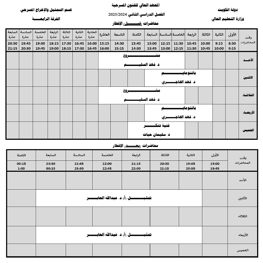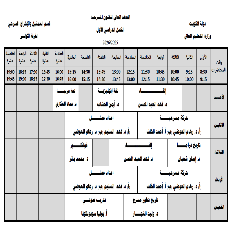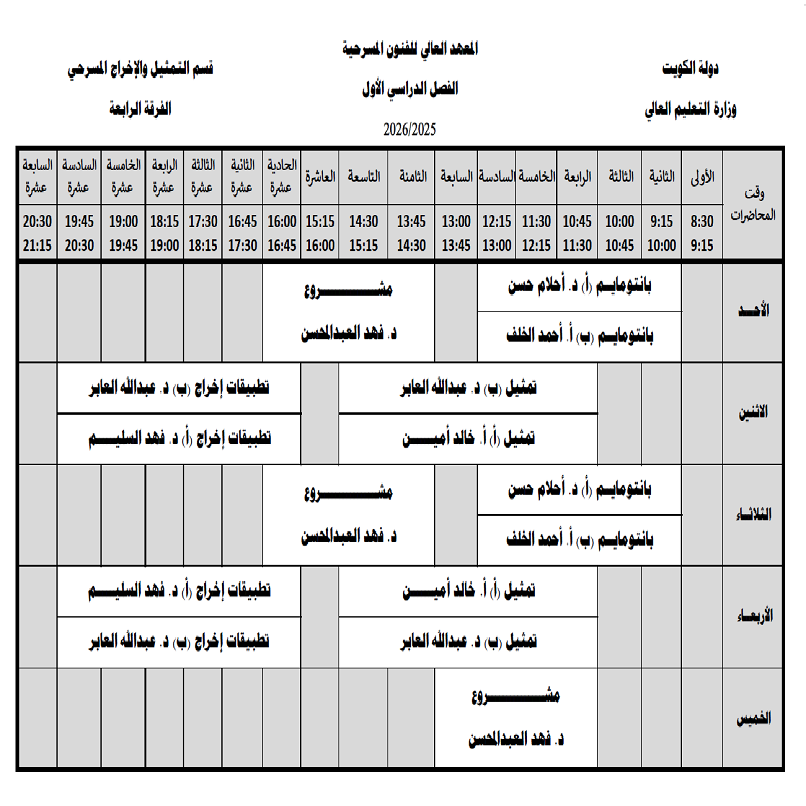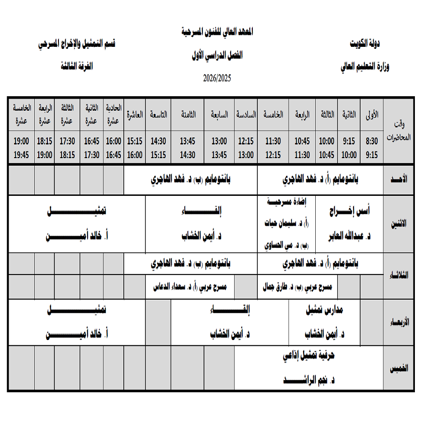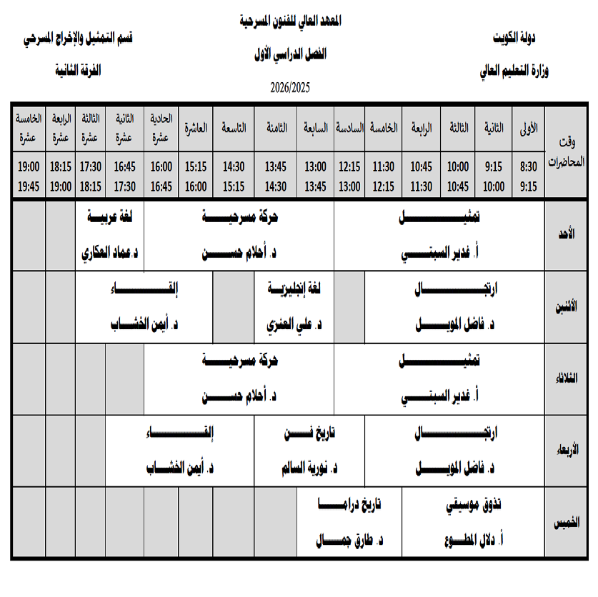 جداول محاضرات قسم التمثيل والإخراج المسرحي الفصل الأول 2025-2026