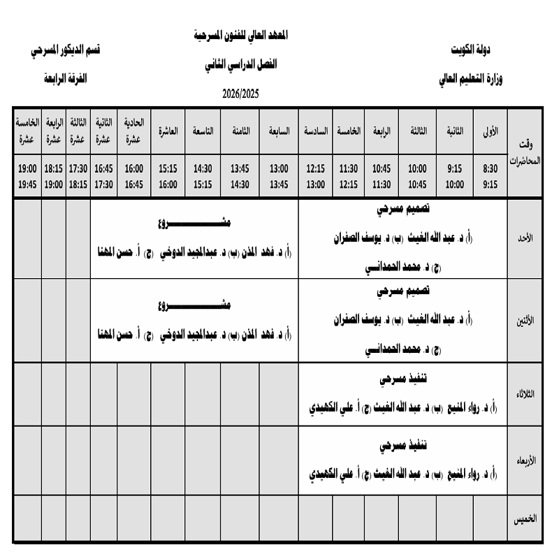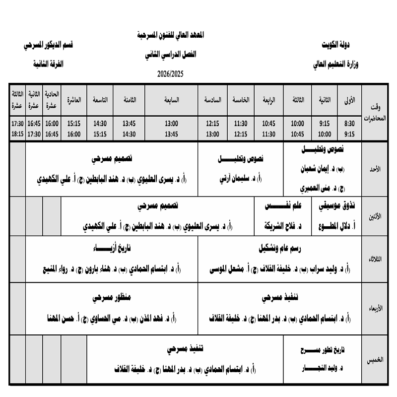 جداول محاضرات قسم الديكور المسرحي الفصل الثاني 2025-2026